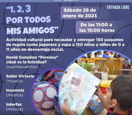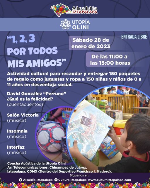 #Iztapalapa, #CDMX.- Este sábado 28 de enero se llevará a cabo el evento 1, 2, 3 POR TODOS MIS AMIGOS, donde se hará una recaudación para la entrega de 150 paquetes de regalo para 150 niños y niñas de 0 a 11 años de edad en desventaja social. Se contará con la participación de David González «Perruno», Salón Victoria, Insomnia e Interfaz.