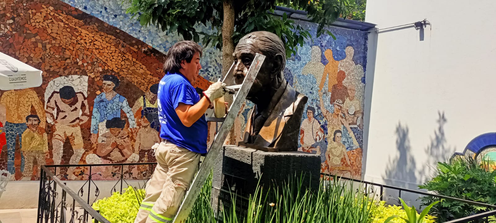 #Cuauhtémoc, #CDMX.-Elementos de mantenimiento de la alcaldía Cuauhtémoc, llevaron a cabo a cabo limpieza y patinado del busto de Jesús Romero Flores, ubicado en la Casa de Cultura de la colonia Hipódromo Condesa.