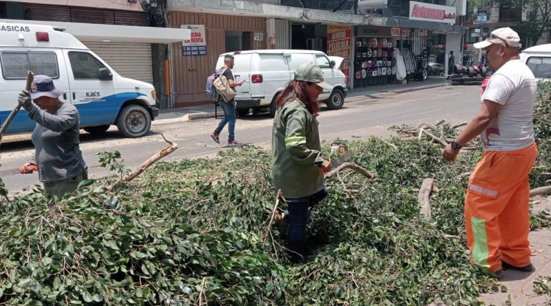 #Cuauhtémoc, #CDMX.- Personal de la Alcaldía Cuauhtémoc continúa con el retiró del árbol que se desprendió en calles de la colonia Juárez, para proceder reparar la banqueta y prevenir accidentes en la zona.