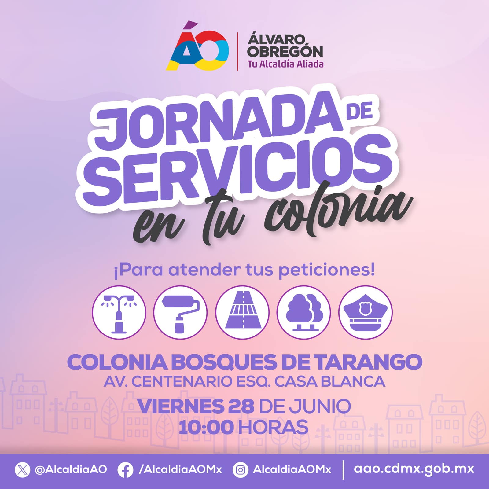 #ÁlvaroObregón, #CDMX.- La jornada de servicios en tu colonia llega a Bosques de Tarango. Este viernes a partir de las 10 de la mañana.