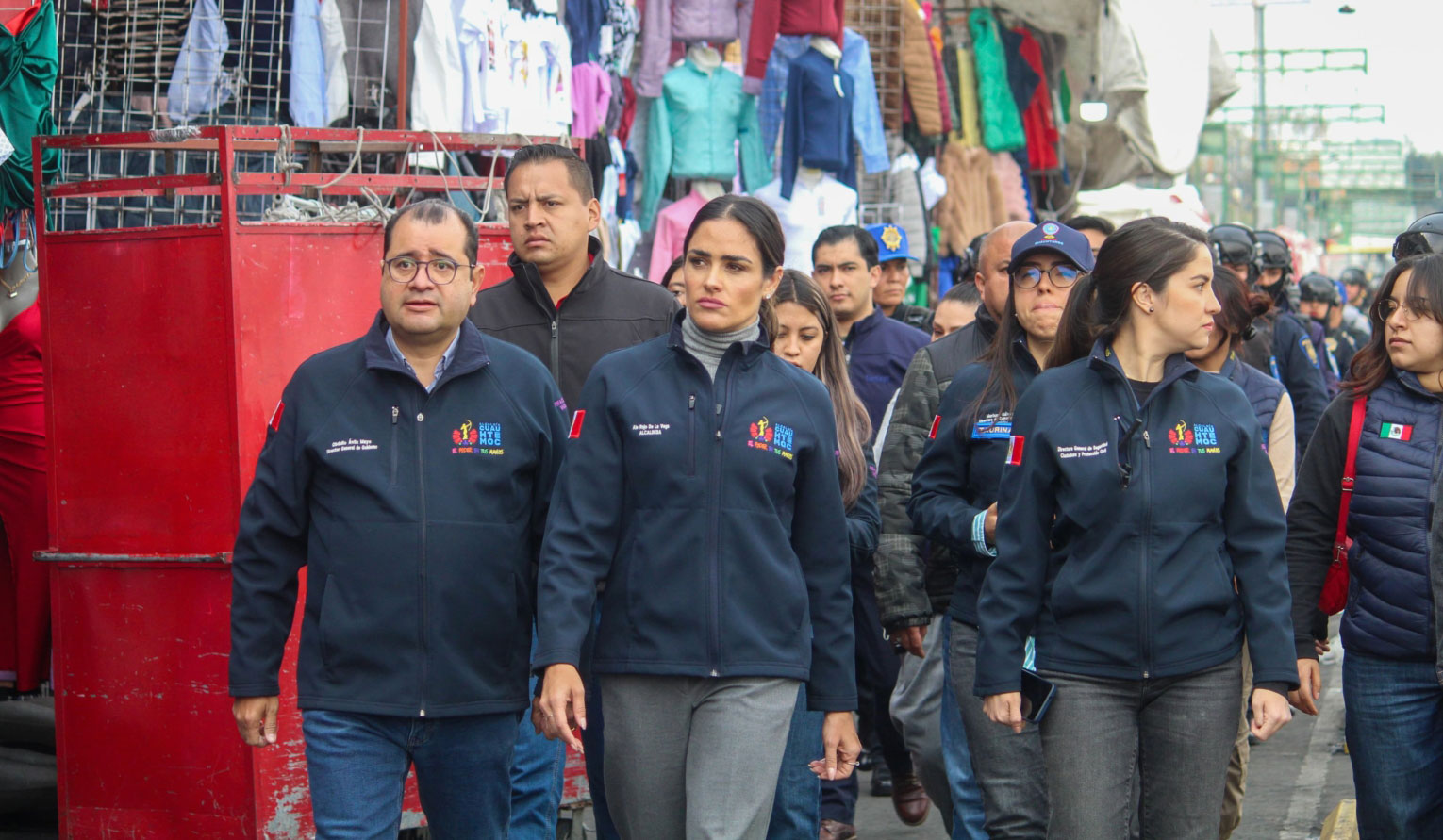 Con el apoyo, en funciones preventivas, de elementos de la Policía Auxiliar adscritos a la Dirección General de Seguridad Ciudadana y Protección Civil de la Alcaldía Cuauhtémoc, así como efectivos de la Secretaría de Seguridad Ciudadana de la Ciudad de México, la mandataria local recorrió el Eje 1 Norte, supervisando las labores de liberación de la vía pública ejecutadas por personal de la Dirección General de Gobierno de la demarcación.